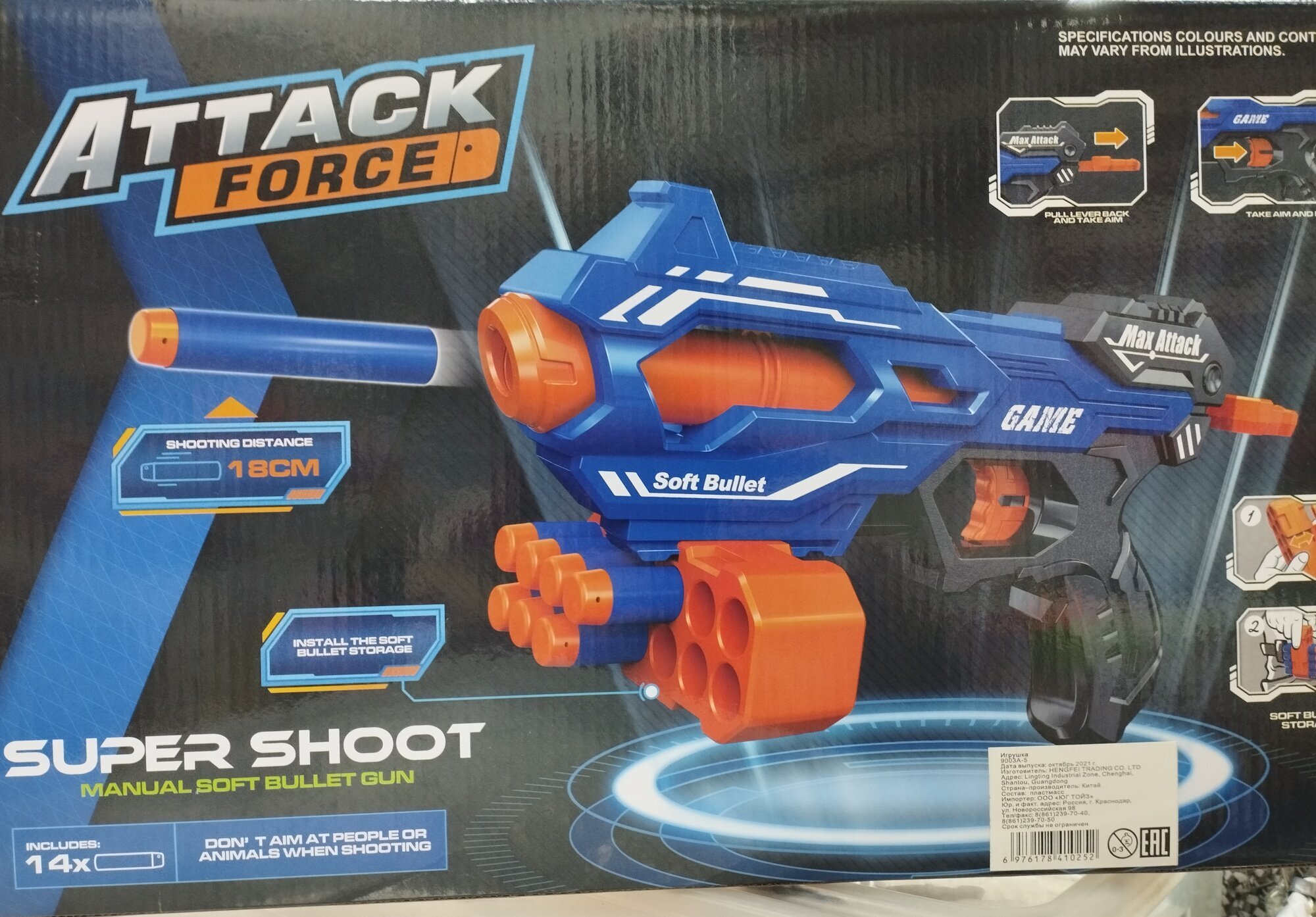 В комплект входят 14 снарядов синего цвета (7 с присоской, 7 с резиновым наконечником)