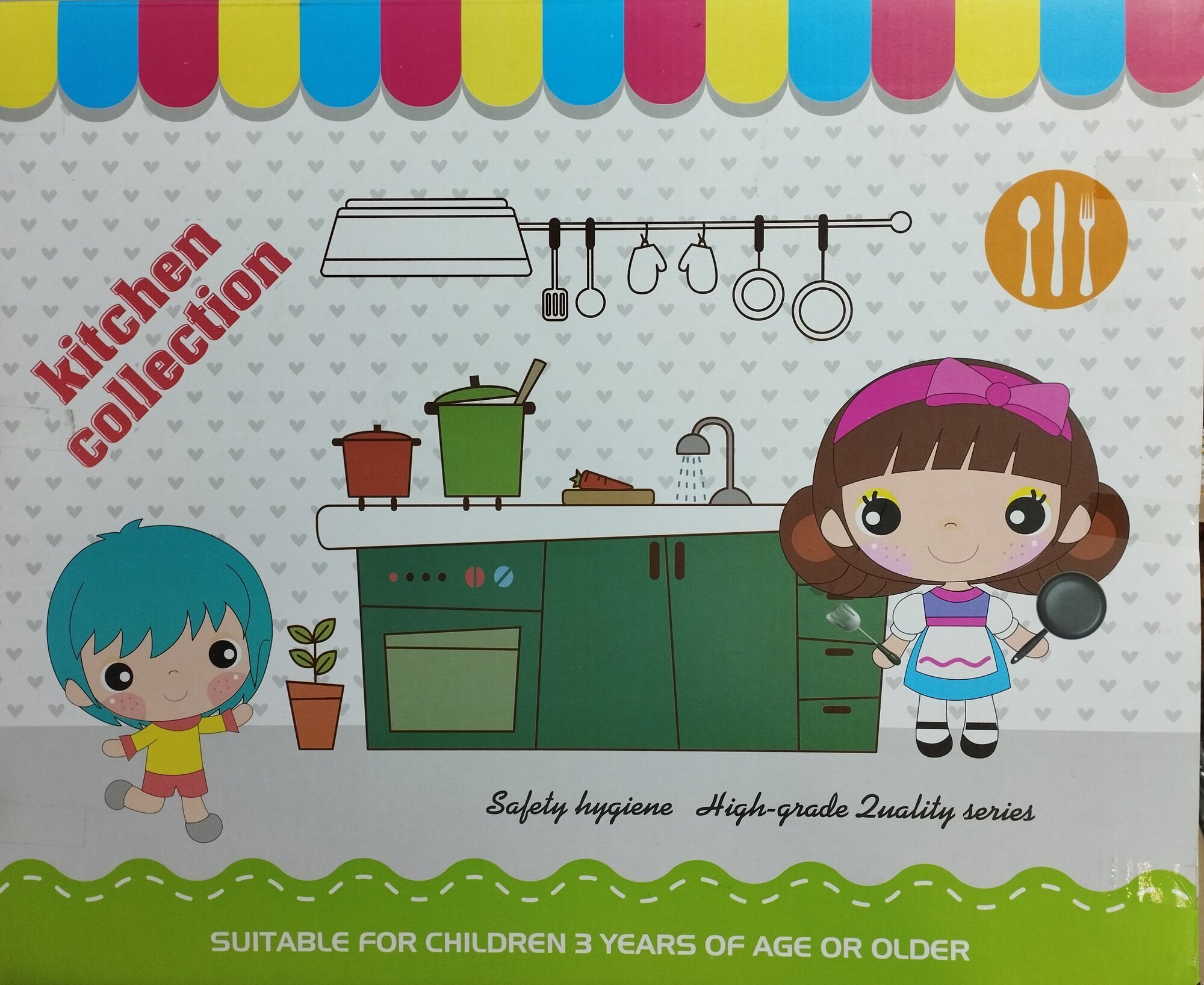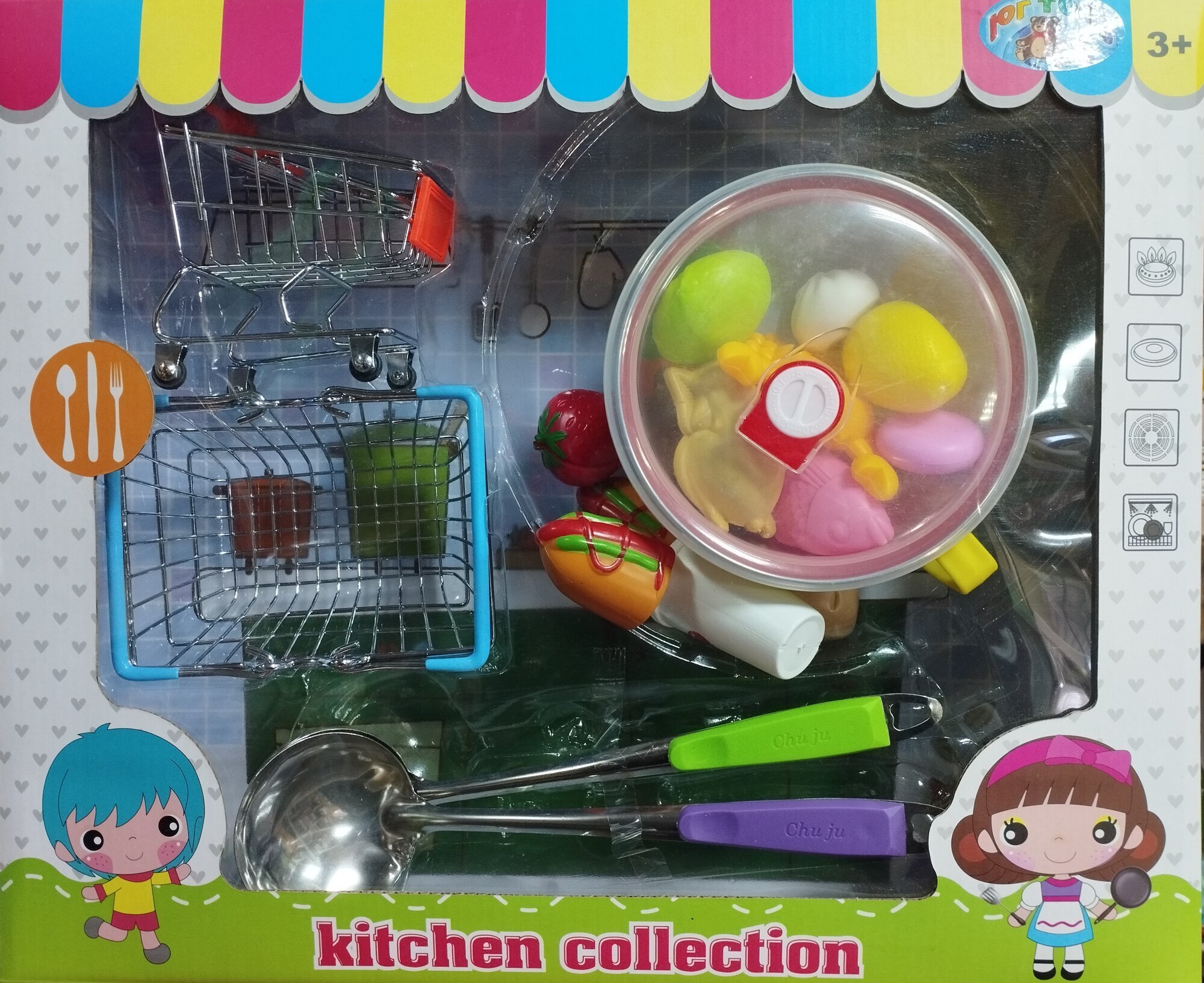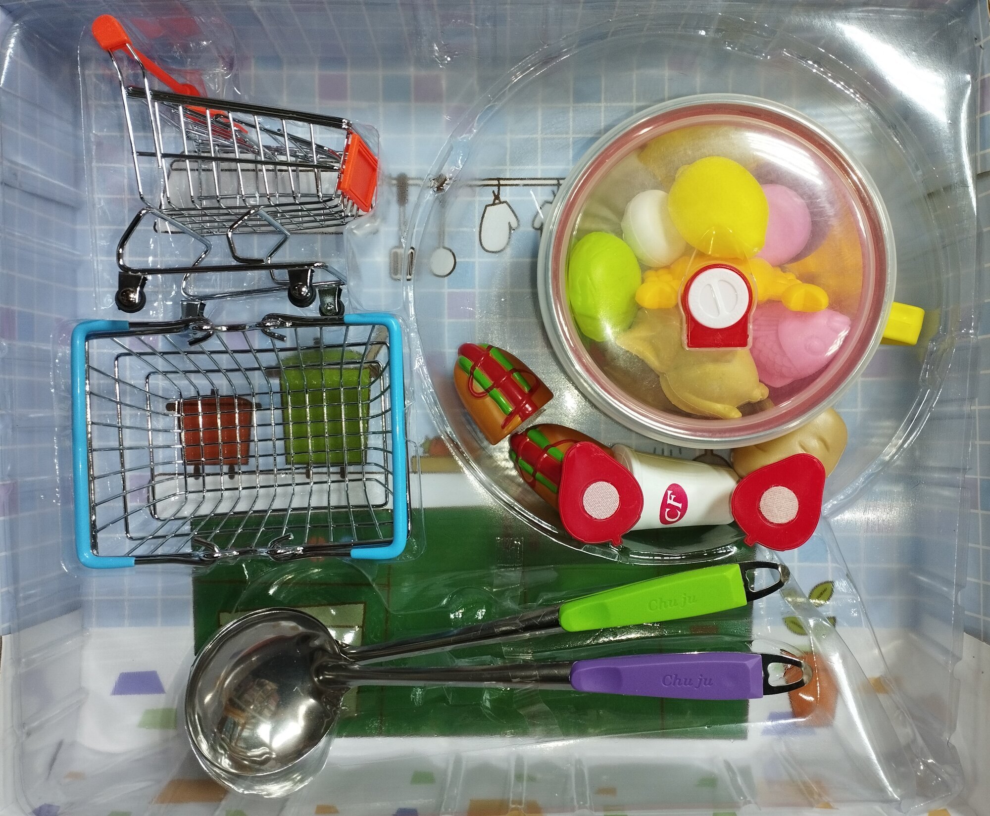 В коробке: посуда для кухни, кастрюля, продукты, 2 половника, корзинка, тележка