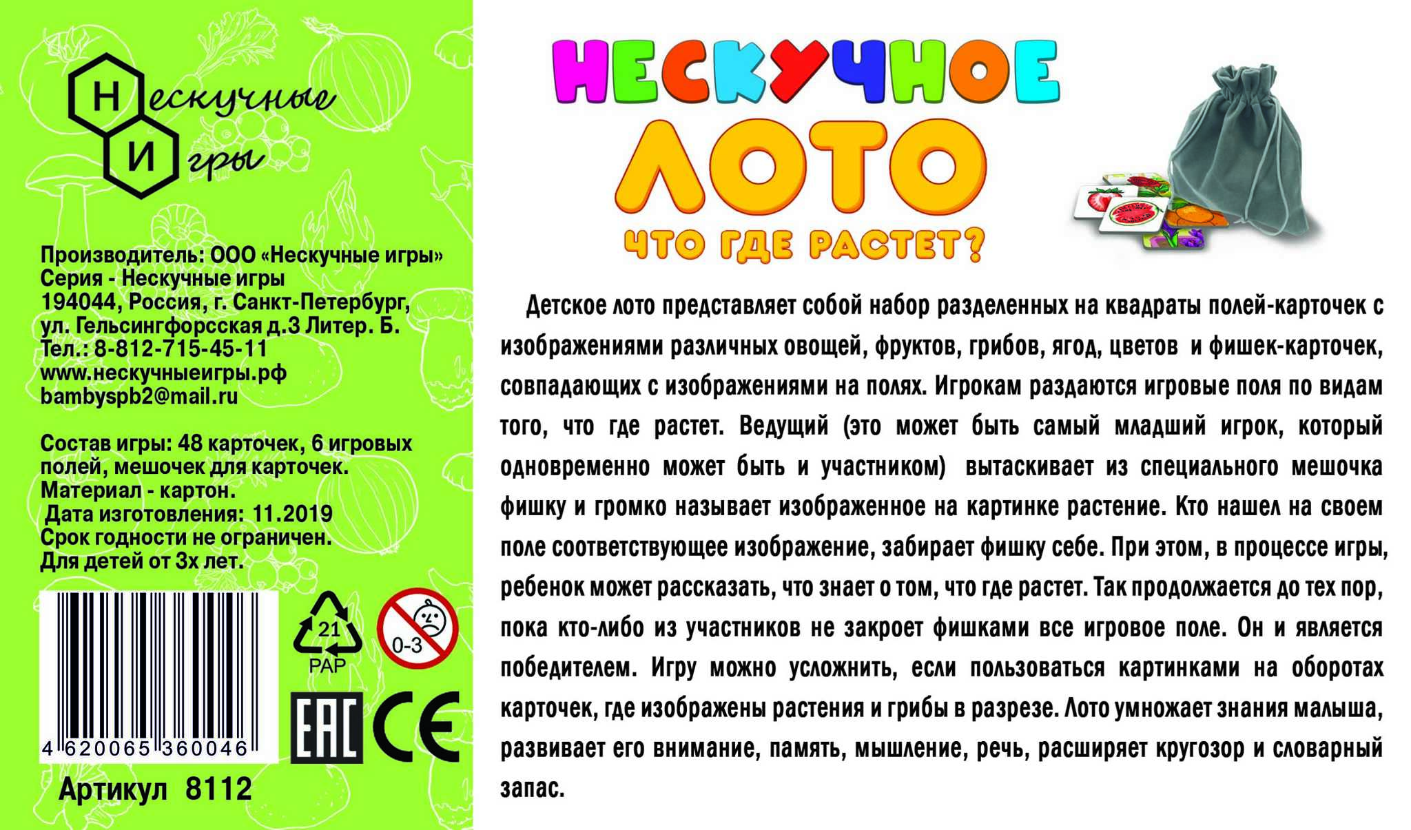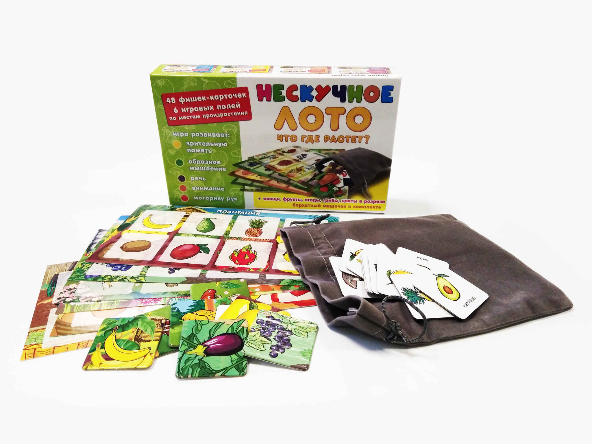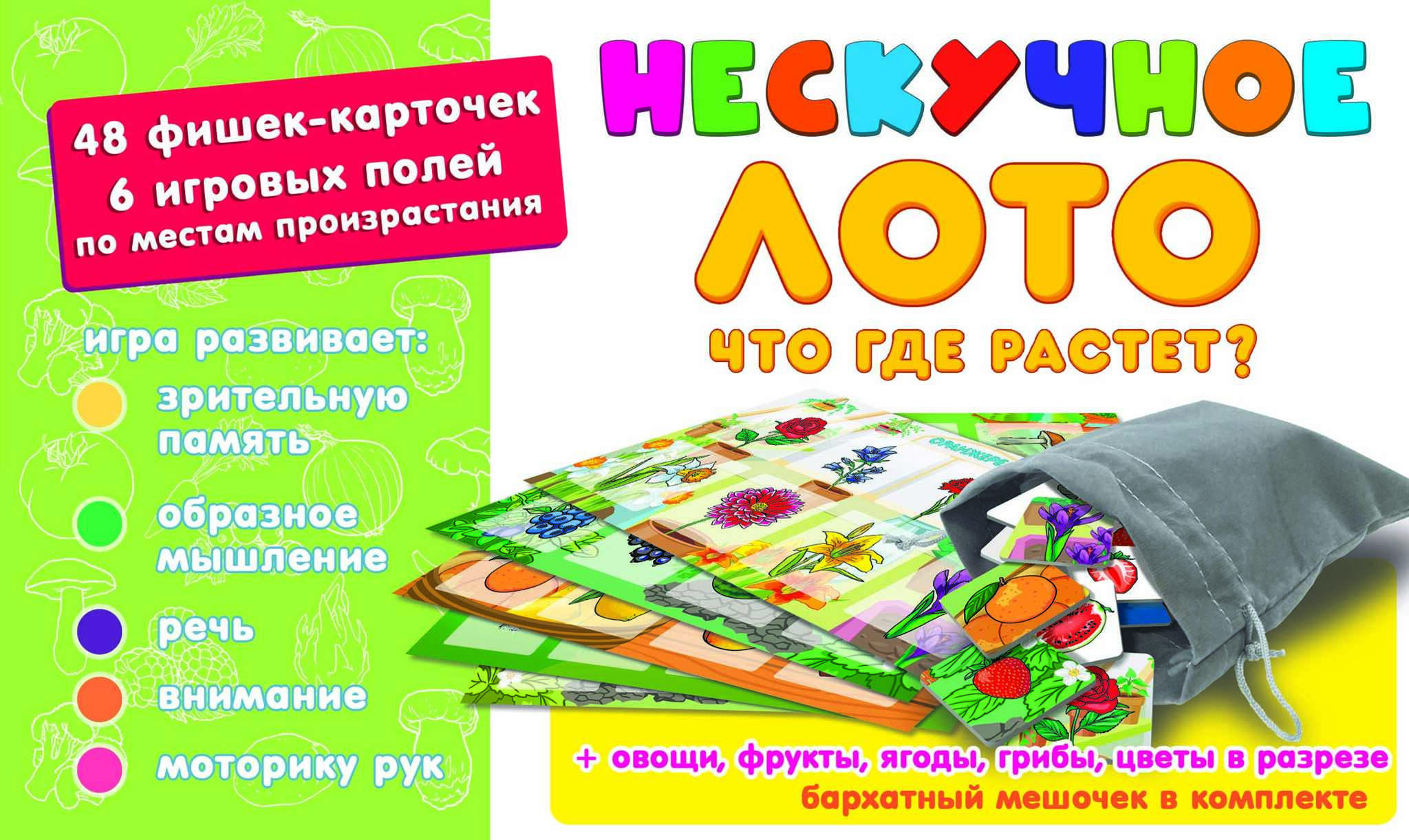 Детское лото представляет собой набор разделенных на квадраты полей-карточек с изображениями различных овощей, фруктов, грибов, ягод, цветов и фишек-карточек, совпадающих с изображениями на полях. Игрокам раздаются игровые поля по видам того, что где растет. Ведущий (это может быть самый младший игрок, который одновременно может быть и участником), вытаскивает из специального мешочка фишку и громко называет изображенное на картинке растение. Кто нашел на своем поле соответствующее изображение, забирает фишку себе. При этом, в процессе игры ребенок может рассказать, что знает о том, что где растет. Так продолжается до тех пор, пока кто-либо из участников не закроет фишками все игровое поле. Он и является победителем. Игру можно усложнить, если пользоваться картинками на оборотах карточек, где изображены растения и грибы в разрезе. Лото умножает знания малыша, развивает его внимание, память, мышление, речь, расширяет кругозор и словарный запас.