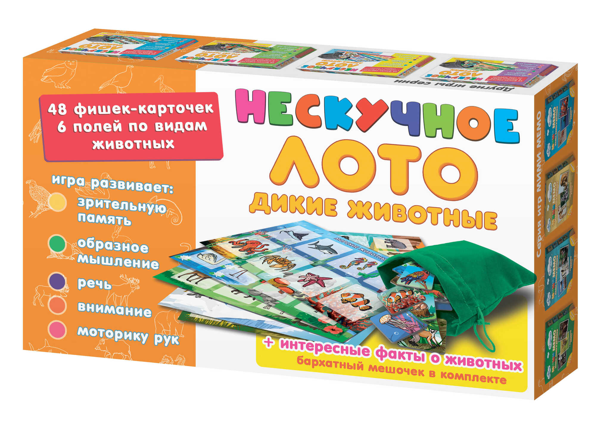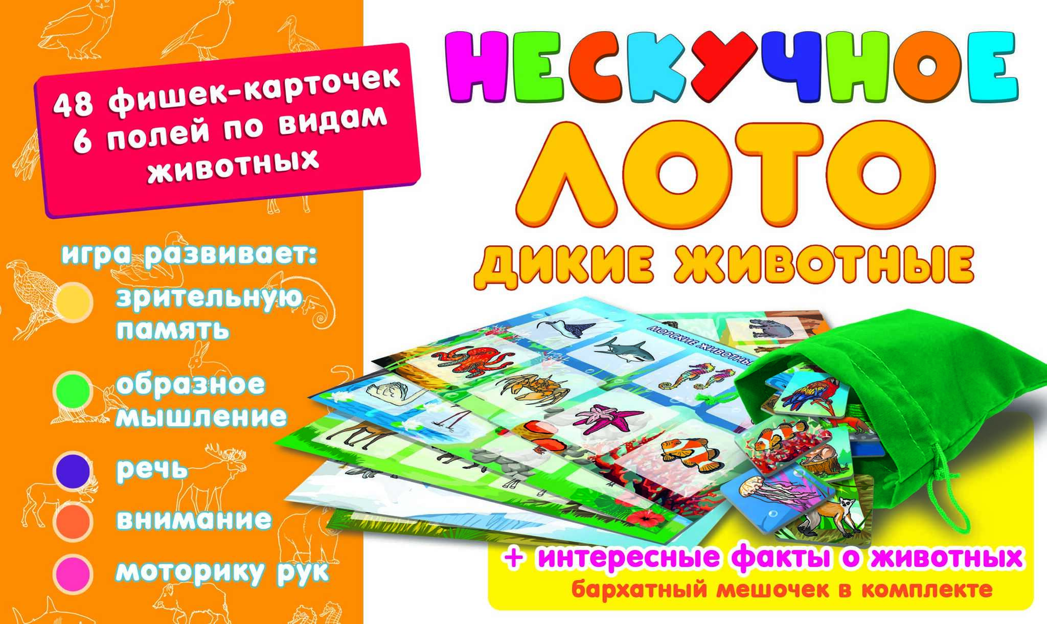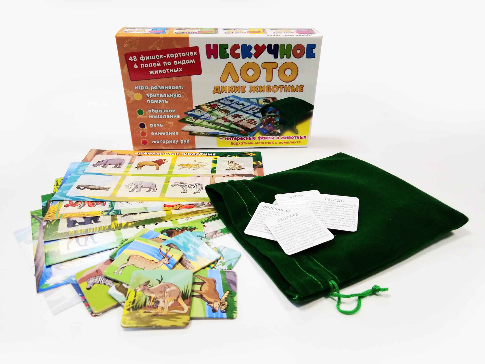 Детское лото представляет собой набор разделенных на квадраты полей-карточек с изображениями различных животных и фишек-карточек, совпадающих с изображениями на полях. Игрокам раздаются игровые поля по видам животных. Ведущий (это может быть самый младший игрок, который одновременно может быть и участником), вытаскивает из специального мешочка фишку и громко называет изображенное на картинке животное. Кто нашел на своем поле соответствующее изображение, забирает фишку себе. При этом, в процессе игры, ребенок может рассказать, где обитает то или иное животное. Так продолжается до тех пор, пока кто-либо из участников не закроет фишками все игровое поле. Он и является победителем. Для усложнения игры и большего веселья, можно назвать не само животное, а его отличительную особенность. Например: “Самое большое, с длинным хоботом, живет в Африке.” Лото умножает знания малыша, развивает его внимание, память, мышление, речь, расширяет кругозор и словарный запас.