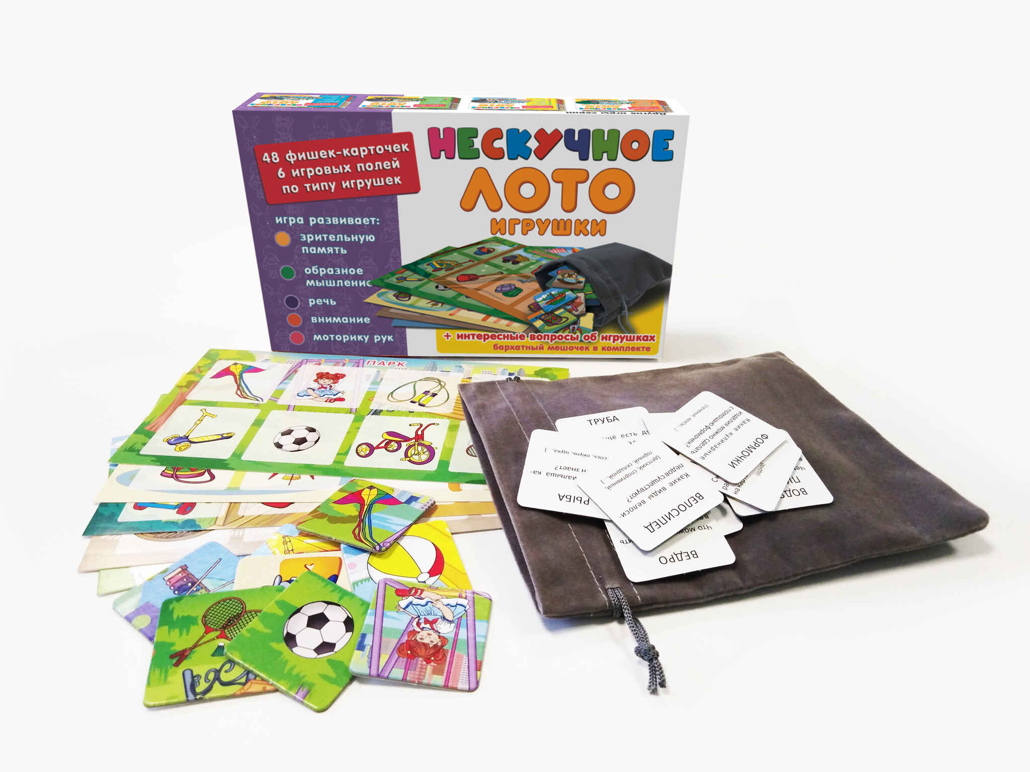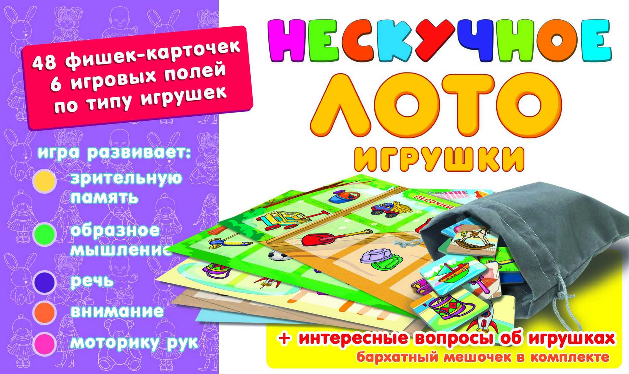 Детское лото представляет собой набор разделенных на квадраты полей-карточек с изображениями различных игрушек и фишек-карточек, совпадающих с изображениями на полях. Игрокам раздаются игровые поля по видам игрушек. Ведущий (это может быть самый младший игрок, который одновременно может быть и участником) вытаскивает из специального мешочка фишку и громко называет изображенную на картинке игрушку. Кто нашел на своем поле соответствующее изображение, забирает фишку себе. При этом, в процессе игры, ребенок может рассказать про ту или иную игрушку. Так продолжается до тех пор, пока кто-либо из участников не закроет фишками все игровое поле. Он и является победителем. На обратной стороне фишек-карточек даны вопросы (родители могут задавать и свои) и примеры вариантов ответов, но малыш может давать и свои версии. Лото умножает знания малыша, развивает его внимание, память, мышление, речь, расширяет кругозор и словарный запас.