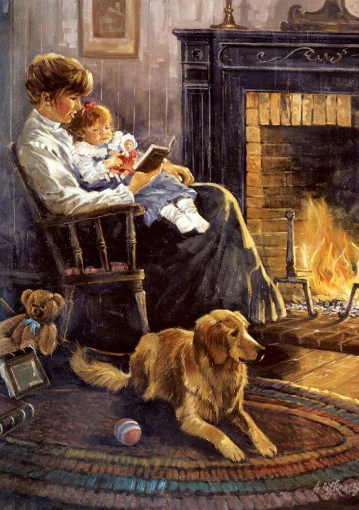 Девушка сидящая в кресло качалке, держит на руках дочку и читает ей книжку. Рядом горит в камине огонь. У ног девушки сидит рыжий пёс.