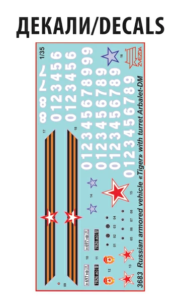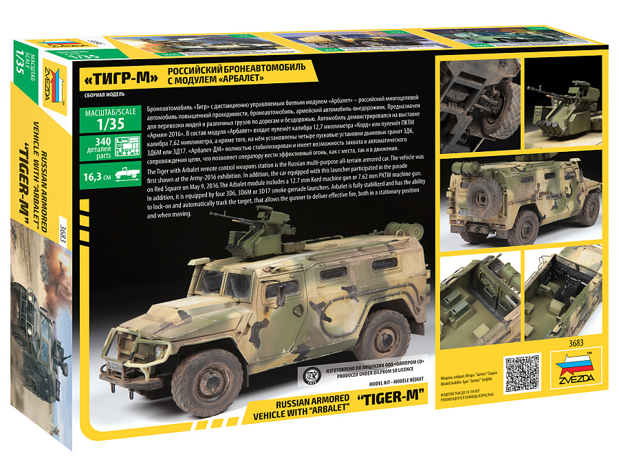Бронеавтомобиль «Тигр» с дистанционно управляемым боевым модулем «Арбалет» – российский многоцелевой автомобиль повышенной проходимости, бронеавтомобиль, армейский автомобиль-внедорожник. Предназначен для перевозки людей и различных грузов по дорогам и бездорожью. Автомобиль демонстрировался на выставке «Армия-2016». В состав модуля «Арбалет» входит пулемёт калибра 12,7 миллиметра «Корд» или пулемёт ПКТМ калибра 7,62 миллиметра, а кроме того, на нём установлены четыре пусковые установки дымовых гранат 3Д6, 3Д6М или 3Д17. «Арбалет-ДМ» полностью стабилизирован и имеет возможность захвата и автоматического сопровождения цели, что позволяет оператору вести эффективный огонь, как с места, так и в движении. Игрушка собирается при помощи специального клея, выпускаемого предприятием «Звезда».
